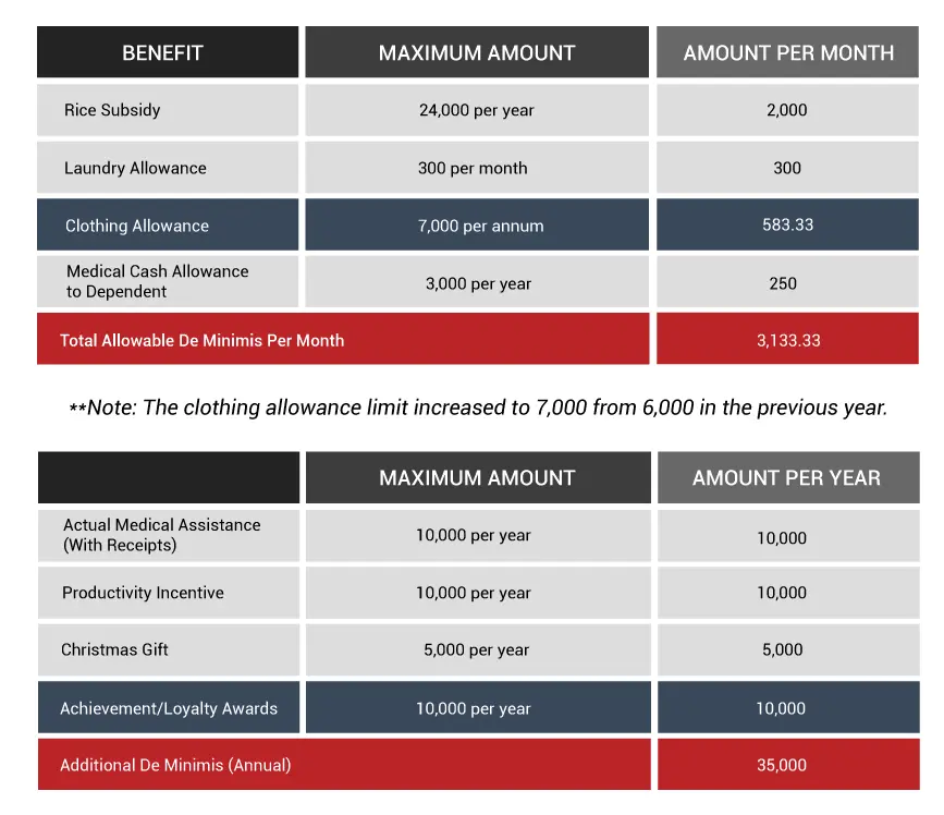 Under RMC 50-2018, it is imperative to note that any De Minimis benefits granted over the prescribed maximum threshold shall be classified under “other benefits” and thereby subject to the Php90,000 statutory ceiling. Any amount exceeding the Php90,000 limit shall be subject to income tax and, consequently, to the withholding tax on compensation.